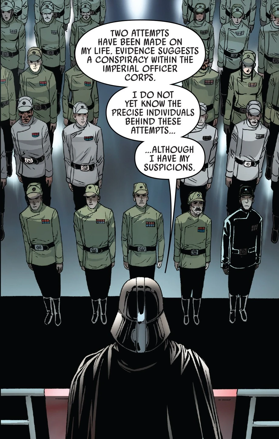 ヴェイダーがレベル1A1以上のアクセス権限を持つ人物の一覧を要請すると、ドロイドはビンガンやトーマス・アゾラス、ウィルハフ・ターキン、カシオ・タッグ、ジャー・クロトー、ジューン・ストレフィ、コリン・フェローらの名前が記載されたリストを提供した。その後、ヴェイダーはコルサント上空で行われた2度目の暗殺計画を生き延び、ナインス・シスターと一緒に乗っていたスターシップでコルサントの地上に不時着した。その後ヴェイダーは瞑想を行い、バロッキ大佐が事件に関与していたことを突き止めた。ヴェイダーからその報告を受けたパルパティーンは、彼のために帝国軍将校団の集会を開くことに決めた。[2]