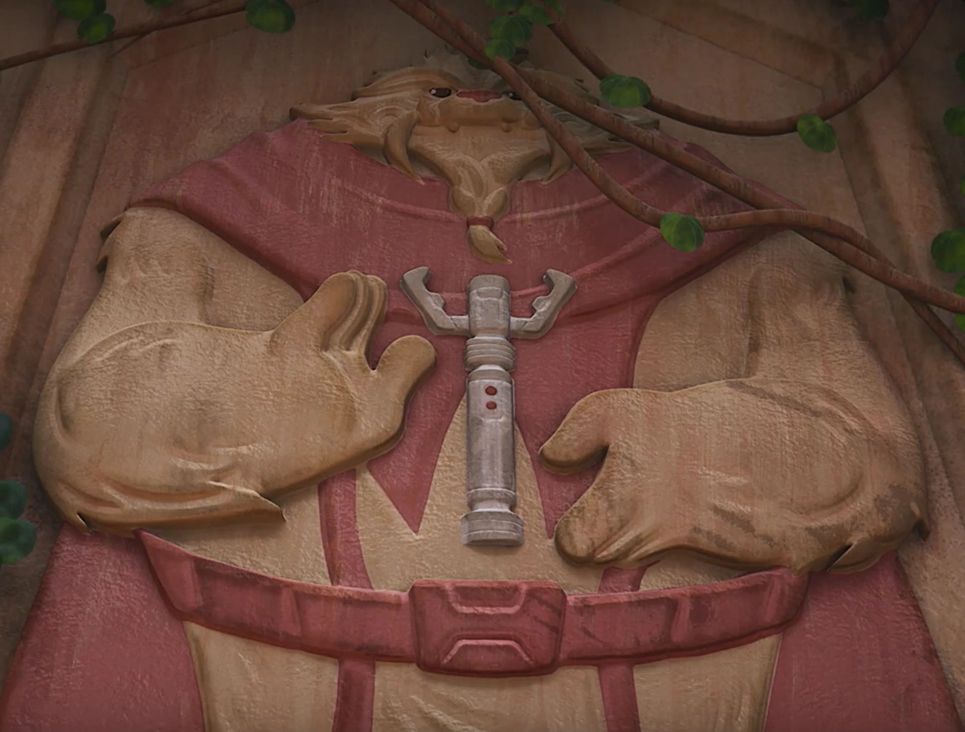 232 BBY頃[3]、ナブスやカイ・ブライトスター、リス・ソレイをはじめとするジェダイ・イニシエイトたちがマスター・ジア・ザルドア・ザナとグランド・マスター・ヨーダに引率され、古代のテンプルを見学した。バラボと同じくプーバ種族であるナブスは、自分と同じ特徴を持つ人物を描いた壁画を見つけ、その表面を覆っていたツタを取り払った。その後、ナブスたちは壁画の下に隠されていた秘密の入り口を偶然発見し、その先の小さな部屋でライトセーバーを発見した。ヨーダは、セーバーの持ち主である壁画の人物がバラボという名前であることをナブスに教え、貴重な遺物であるセーバーを惑星コルサントのジェダイ・アーカイブに保管することにした。[1]
