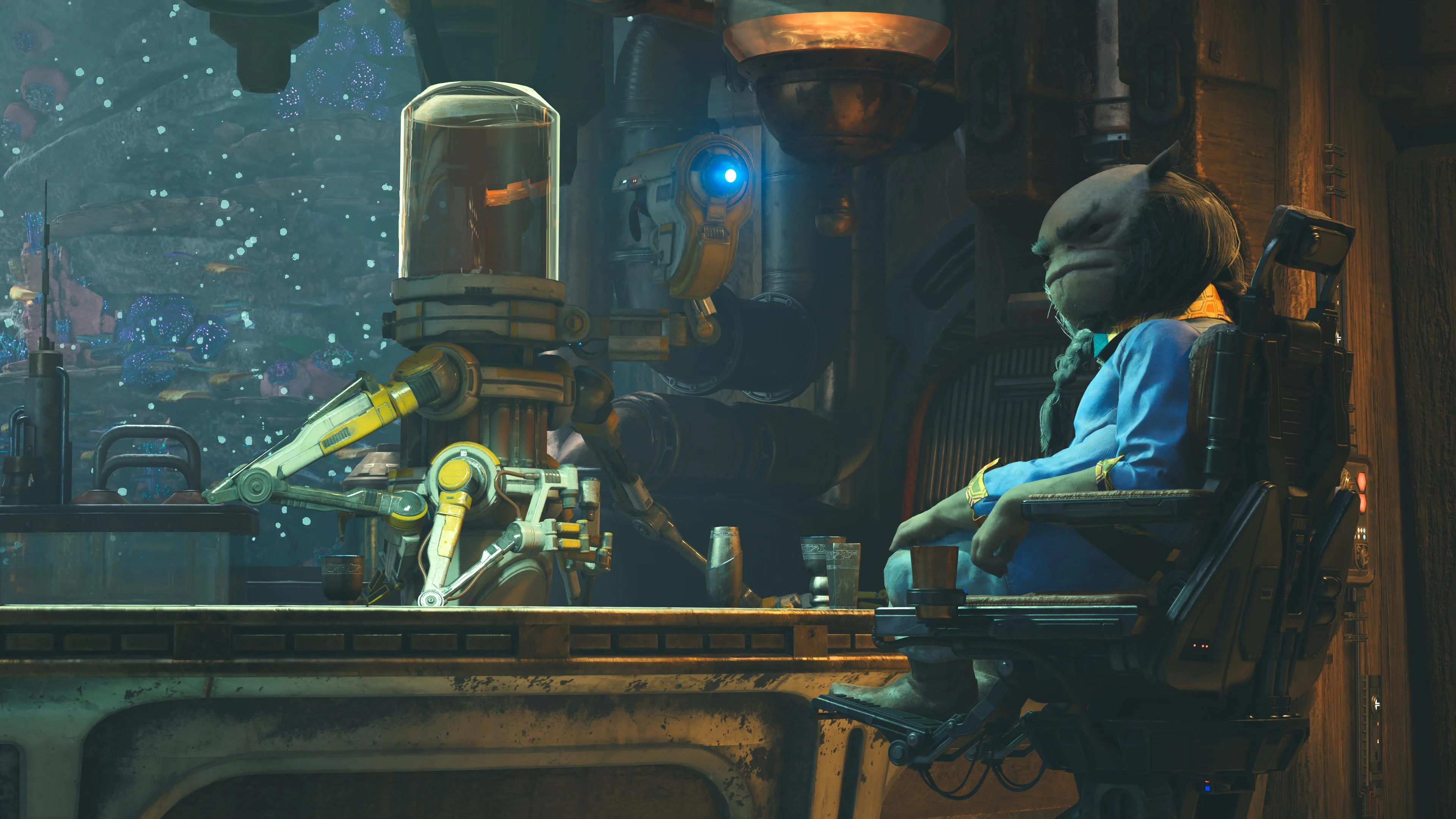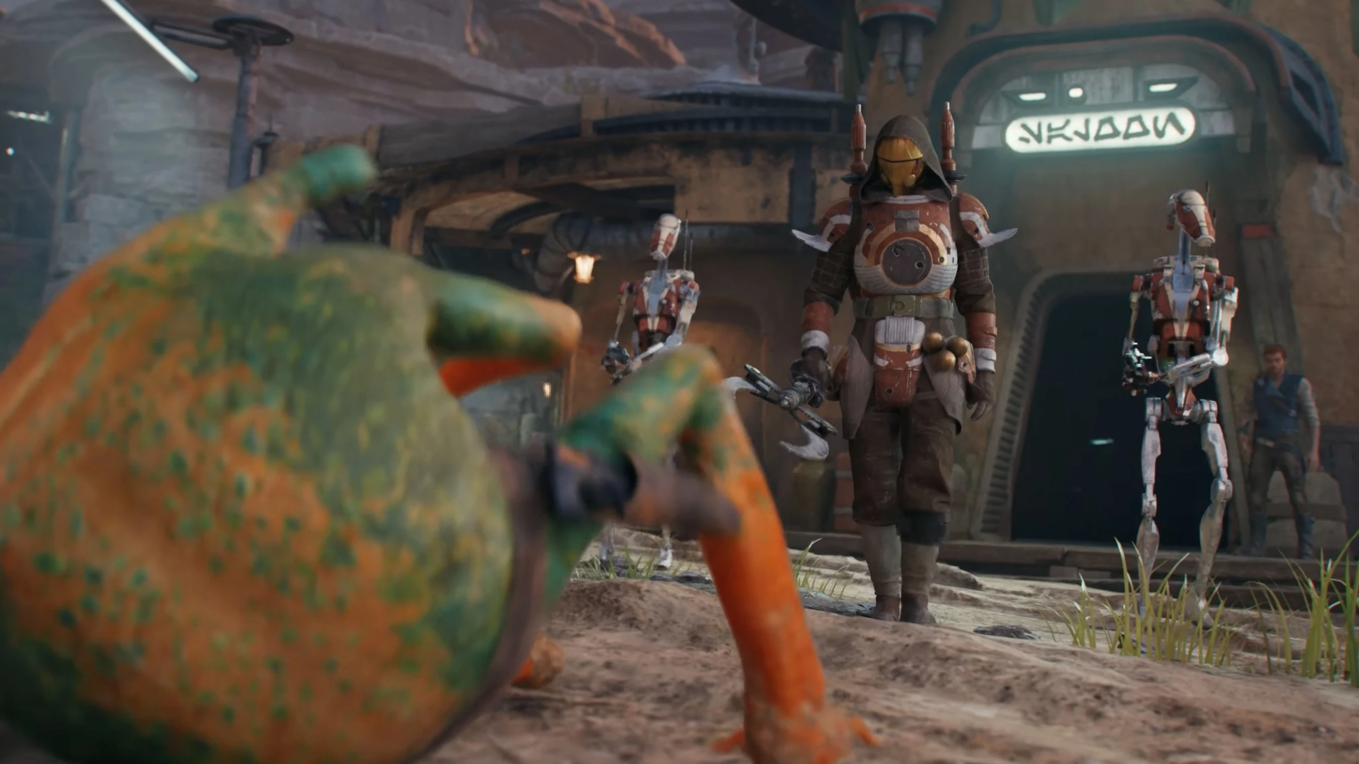 - 「ファンがキャラクターを愛するように、我々もキャラクターを愛しています。プレイヤーがちょっとしたカタルシスを求めているかもしれないと思って、カンティーナにいる友人たちとの会話や、カルが経験したことを整理できるような会話をたくさん書きました……ファンがゲームをクリアした後も戻ってきて、探検や、パイルーンにいるお気に入りのキャラクターと会話して過ごす時間を作りたかったのです。もちろんその相手はターグル……だったり、あるいはスクーヴァかもしれません」