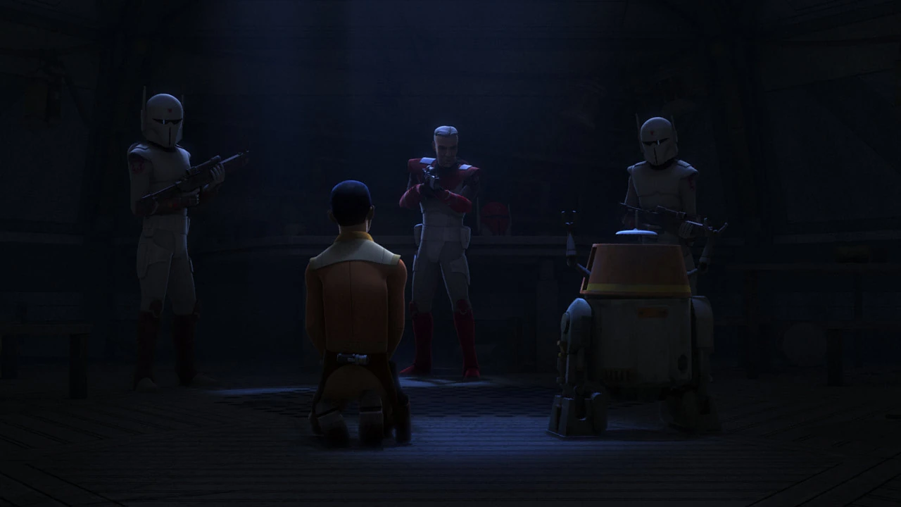 一方、ガー・サクソンはプロテクターのキャンプの中でエズラとチョッパーの尋問を始めた。エズラはゴミ漁りだと名乗ったが信じてもらえず、サクソンはチョッパーにブラスターを向けて真実を無理やり聞き出そうとした。建物の外では、サビーヌが友人を救うためラウを説得し、敵の手に渡る前に<ファントムII>を回収してくるよう頼んだ。サビーヌはまた、フェニックス戦隊の秘密基地の場所が帝国に知られてしまうのではないかと危惧していた。サクソンを憎んでいたラウは、反乱者への協力に同意する。