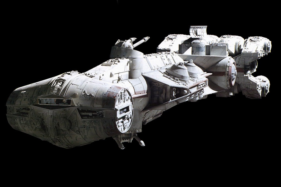 CR90コルベットは1977年の映画『スター・ウォーズ エピソード4/新たなる希望』のためにデザインされた船種であり、その1隻である<タナヴィーIV>はスター・ウォーズ シリーズ全体を通して最初に登場した宇宙船である。[11] その起源は<ミレニアム・ファルコン>の初期デザイン・コンセプトであり、<ファルコン>はもともと細長い宇宙船で、おなじみの円錐型のコックピットが先頭部分に配置されていた。しかし『スター・ウォーズ』が制作されていた頃にTV番組『スペース1999』によく似たデザインの宇宙船が登場したため、模倣と思われないよう<ファルコン>のデザインが見直され、現在の円盤型へと発展していった。その結果、当初の<ファルコン>のデザインが“ブロッケード・ランナー”として採用されることになった。劇中にさほど登場しないにも関わらず、精巧なミニチュアが作られたのもそのためである。[53]