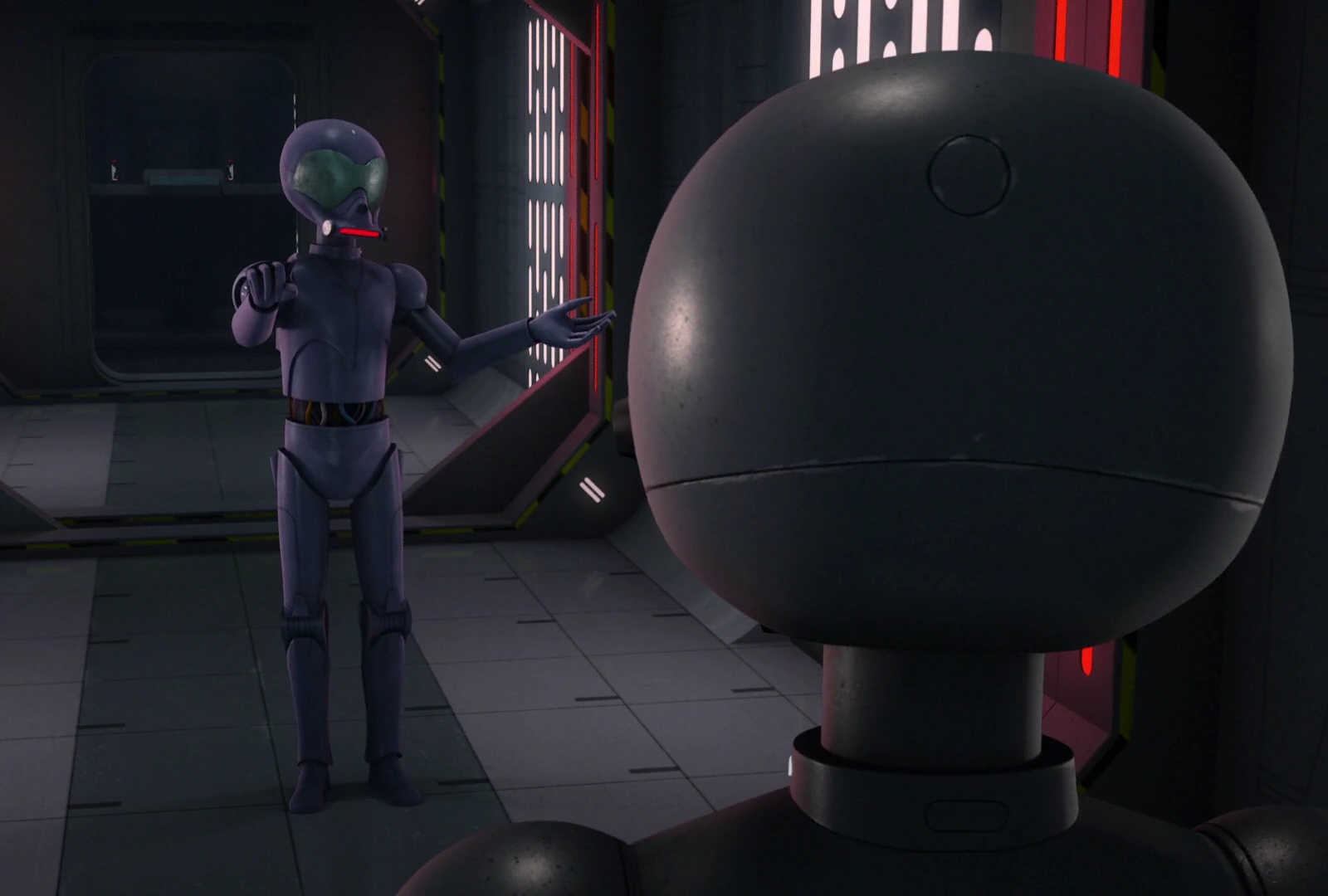PZ-7はAP-5を呼び止め、施設のこのレベルに別の在庫管理ドロイドがいるとは聞いていないと注意したが、AP-5はPZ-7が貨物プラットフォーム係に配置換えになったと嘘をつき、自分は代役で来たのだと主張した。PZ-7が素直に立ち去った後、AP-5はコンピューター・コアからデータを抜き取ることに成功した。
