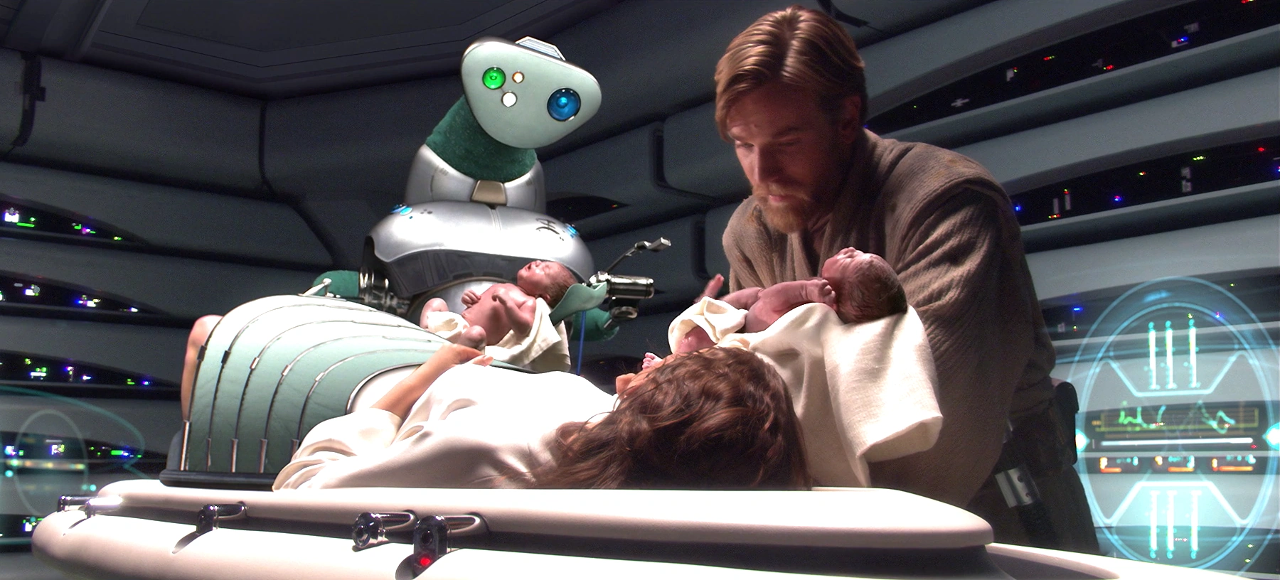 케노비와 베이더의 광선검 결투가 끝나고 홀로 남겨진 베이더는 용암으로 인해 끔찍한 상태로 변해서 생존을 위한 갑옷이 착용된다. 한편 케노비는 의식을 잃은 파드메를 폴리스 마사라는 소행성으로 데려갔다. 드로이드 의사는 그녀가 살 의지를 잃고 죽어감을 발견했으나, 쌍둥이 루크와 레아를 낳을 정도로 길게 생존하였다. 그녀는 출산 직후 사망하였고, 이는 베이더의 환상이 실현된 것이었다. 그녀는 다스 베이더에게 선함이 남아 있다고 믿었다.[1] 이후 루크와 레아를 베이더에게서 숨겨야 하게 되었다. 그는 아미달라의 출산 사실을 몰랐을 뿐만 아니라 자신이 아미달라를 죽였다고 믿었다. 루크는 오웬 삼촌과 베루 이모에게 맡겨졌고 레아는 아미달라의 친구이자 동료인 얼데란의 베일 오르가나 의원과 아내인 브레하 오르가나 여왕에게 입양된다. 아미달라의 시체는 탄티브 III호를 통해 나부로 이송되었으며 쌍둥이 출산 비밀이 새어 나가지 않도록 여전히 임신 중인 것처럼 꾸며졌다.[1] 시체 조작은 코모덱스 탄이라는 장의사가 담당하였다.[6]
