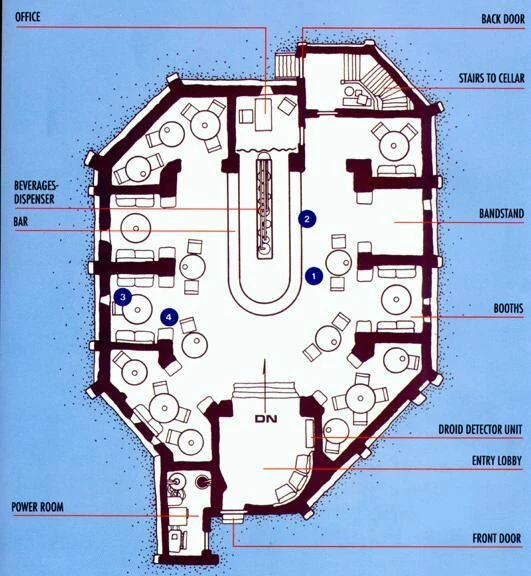 De Cantina was een min of meer rechthoekig gebouw. Na de ingang was er een bocht naar links die toegang gaf tot de eigenlijke cantina. Aan de ingang stond een EPT-212 Droid Detector Unit opgesteld die waarschuwde wanneer er droids de Cantina betraden. Wuher en Chalmun waren geen liefhebbers van Droids die trouwens geen consumptie konden gebruiken in de Cantina. Die werd zelf in twee gedeeld door een toog. Een achttal inhammen waren voorzien aan de zijkanten waar klanten aan tafels op wat meer privé konden rekenen. De privé-vertrekken van Chalmun zoals zijn kantoor, zijn bar, de kelder en een vluchtruimte waren niet toegankelijk voor het cliënteel.