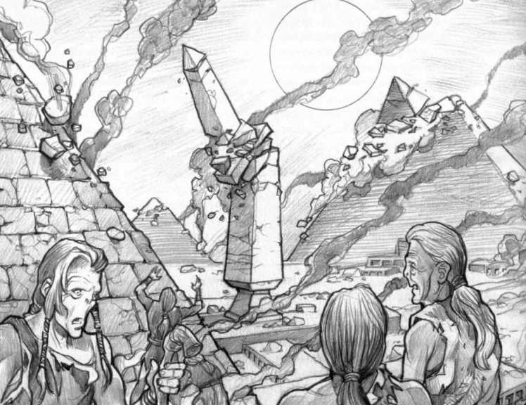 Aan boord van de Falcon ontmoeten ze opnieuw Mohs, die ineens was verdwenen in de piramide. De oude Toka is nu vol bij zijn verstand gekomen. Samen met Lando legt hij uit dat de Toka eigenlijk de primitieve afstammelingen zijn van de Sharu. De Sharu lieten hun vergevorderde samenleving op een bepaald moment verdwijnen. Hun steden verborgen ze onder de piramides en de Sharu verloren hun kennis totdat ze de eenvoudige Toka werden. De Mindharp zou echter de samenleving van de Sharu weer tot leven doen wekken, aangezien het als een teken zou worden aanzien dat de Sharu weer veilig waren om voort te leven. Dat zou beteken dat de steden van de Sharu uit de grond zouden komen en korte metten zouden maken met alle huidige gebouwen.