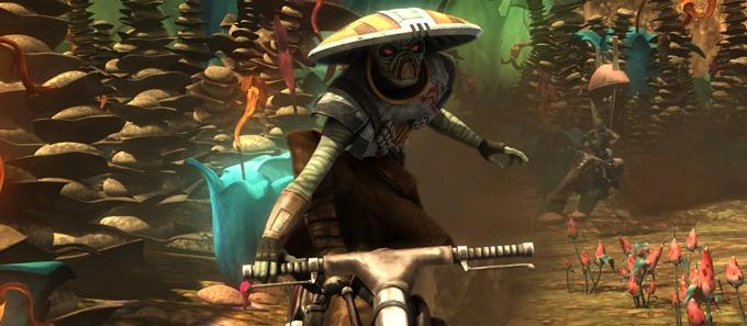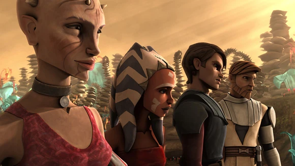 Sugi, a líder do grupo de caçadores de recompensa, junto aos Jedi em Felucia.