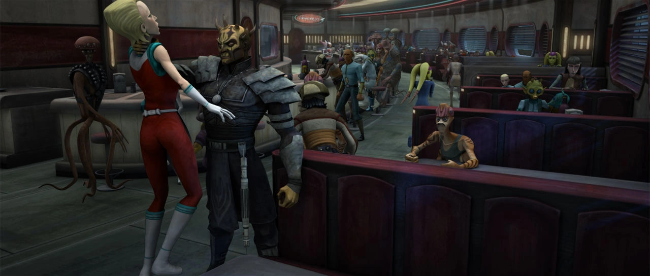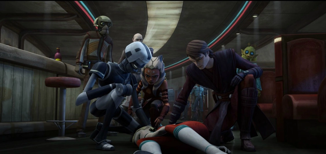 Anakin e Ahsoka chegam na lanchonete, Anakin sente uma perturbação na Força.