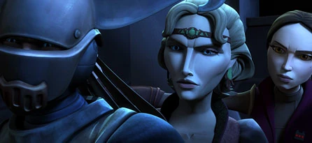 Satine falando com o Conselho do Ministério dos Novos Mandalorianos.