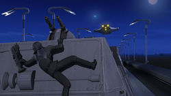 De volta à rodovia sul, um dos motoristas de combate imperiais usa uma granada para abrir a porta esquerda do transporte de tropas dos espectros. O motorista de combate ataca Ezra, mas Kanan luta contra. O homem joga Kanan no chão e tenta prender Tseebo. No entanto, Kanan usa a Força para arremessar o motorista no segundo piloto de combate, nocauteando a segunda moto.