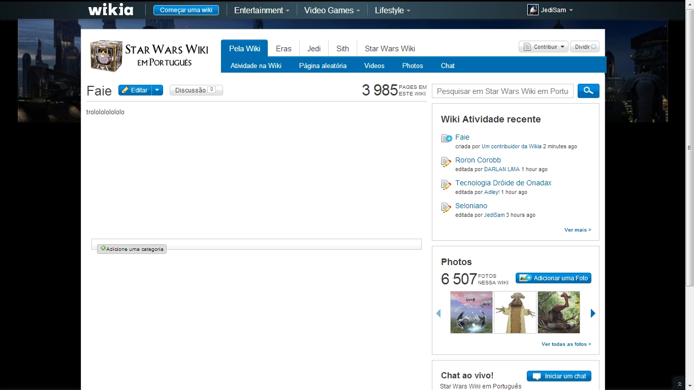 E sade... bem, uma coisa de cada vez né? Foi pra isso que criei esse projeto, para nós organizarmos melhor as edições, temos pouca gente pra muita coisa, se todo mundo for editar todo tipo de página não vai mudar nada... mais pra frente veremos outros aspectos como naves e planetas... ;) JediSam(discussão) 22h11min de 23 de Janeiro de 2013 (UTC)- Tá certo, Sam, só queria que você explicasse mais a respeito desse ponto, hehe. Agora já estou mais tranquilo com essa questão! Thales César (discussão) 22h15min de 23 de Janeiro de 2013 (UTC)