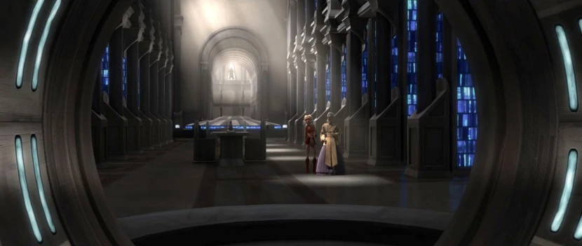 Ahsoka Tano e Jocasta Nu caminham pelo Quarto Salão