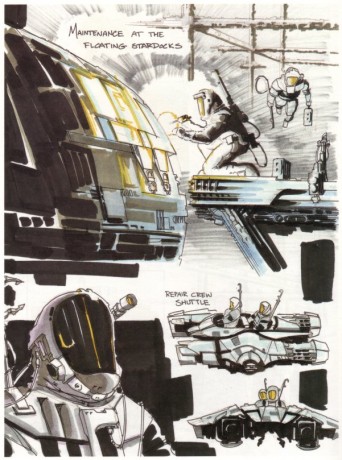 Tripulação de reparo de transporte nas docas estelares flutuantes de Kuat