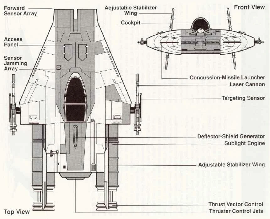 O A-Wing possui um sistema de potência MPS bpr-99 e um reator de fusão que permitem alimentação da nave.Seus motores gêmeos Novaldex J-77 Event Horizon (cadência de 400 KTU) são os responsáveis pela sua velocidade assombrosa, que nem mesmo o TIE Advanced x1 de Darth Vader conseguia alcançar. Como armamento, o caça dispunha de dois canhões laser Borstel RG9 (disparo simples ou sincronizado) e dois lança-mísseis de impacto Dymek HM-6 ( com 6 mísseis cada). Para a proteção, a nave possuía geradores de escudos defletores Sirplex Z-9 dianteiro e traseiro (50 SBD) e o casco constituído de liga de titânio (15 RU).