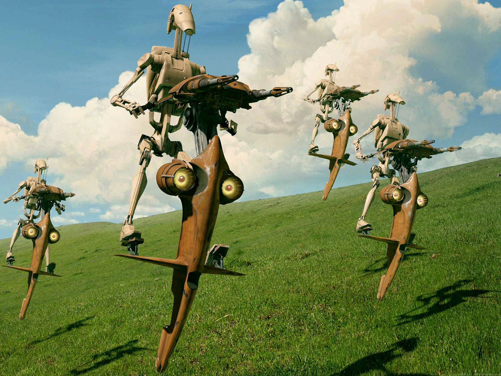 Droides de batalha B1 pilotando PAMs sobre as planícies de Naboo.