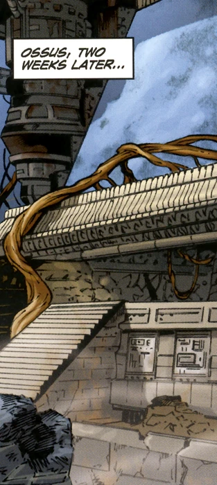 Руины храма были осмотрены пиратом Равом, помощником Кейда Скайуокера, спустя сутки после того как он был сбит ситхами. Формовшик Нея Рин, которой не было на планете во время боя, вернулась на Оссус и обнаружила храм разрушенным. Она и её помощники кремировали Кола Скайуокера и собрали все артефакты, которые сумели найти, спрятав их в поземной пещере. Кейд, Вульф Сазен, К'Крук и Шейдо Вао обнаружили Рин и её охранников и укрылись в подземельях храма, чтобы переждать.