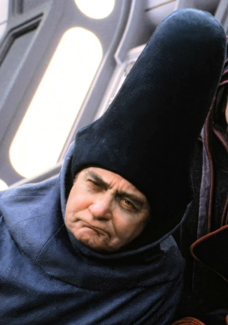 У него были длинные усы и широкие брови. Несмотря на угрюмое выражение лица, его необычная растительность на лице давала ему решительный вид. Как и прочие члены Имперского правящего совета, он носил цветастые робы и шляпы[1].
