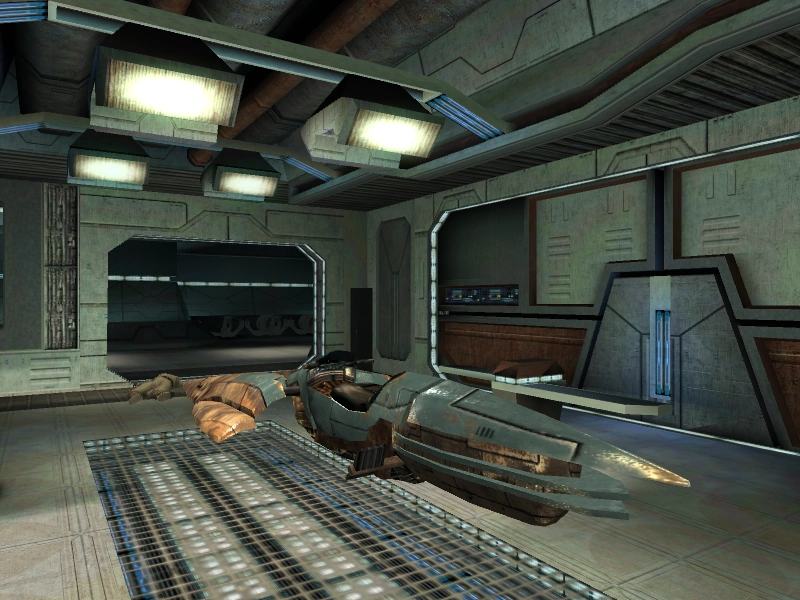 Лифт вёл в основное помещение гаража, где хранились спидеры, были установлены подвесные краны и мощная вентиляционная система. Также к этому помещению примыкал загрузочные отсек с большими воротами для возможности выгрузки крупных грузов. К югу от этого помещения располагались два отсека для обслуживания спидеров, где также имелся верстак, комната для персонала с кроватями и лаборатория двигателей, которая открывалась только при помощи ключ-карты главы гаража. На запад от основного помещения вёл коридор, который кончался офисом главы гаража. Там же был установлен компьютер гаража, взломав который можно было получить доступ к плану помещения, камерам, установленным в гараже, перегрузить двигатели свупов в гараже, что включало сигнал тревоги и приводило к взрыву свупов, разблокировать все закрытые двери и перегрузить терминал.[2]
