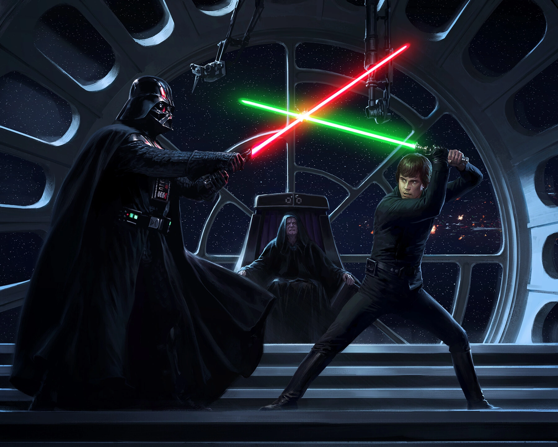Хотя Скайуокер и отказывался продолжать биться с отцом на световых мечах, сражение с Тёмной стороной и собственным гневом он почти проиграл. Когда Вейдер прочел мысли Люка о сестре, то предположил, что она перейдет на темную сторону в случае отказа Скайуокера. В ярости Люк напал на отца и, оттеснив ситха к бортику шахты, отсек ему руку, как год назад Вейдер сделал то же самое Скайуокеру на Беспине. Довольный император рукоплескал Люку Скайуокеру и призывал джедая добить поверженного Вейдера, чтобы занять место отца возле него. Люк быстро осознал, что чуть не совершил непоправимую ошибку, потому он отключил и отбросил свой световой меч в сторону и объявил себя джедаем, каким когда-то был и его отец.