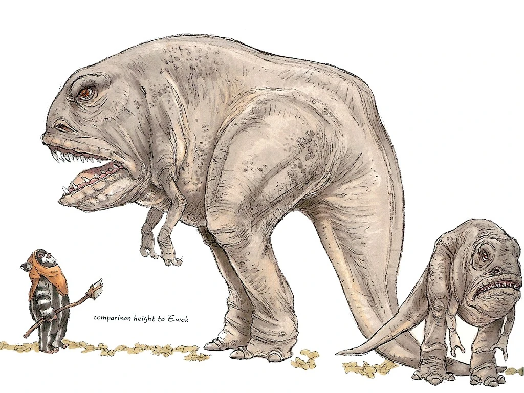 Сравнение размеров. Слева направо: эвок, бларрг (взрослая особь), бларрг (молодая особь)