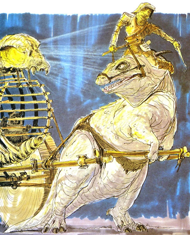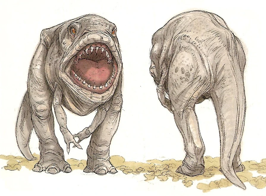 - Джорак: «Большая ящерица. Ходит на задних лапах. Трёхпалый — так его дети называют. Используем для верховой езды. Очень сильное, но глупое. В ярости очень опасное».