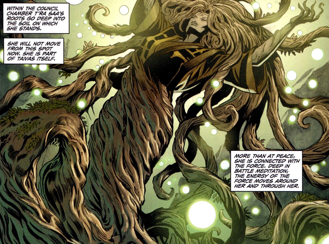 Мастер-джедай Т'ра Саа приступила к обороне Скрытого храма, чтобы защитить джедаев от высадки ситхов-солдат Дарта Крайта и помочь союзникам эвакуироваться сквозь линии врагов[25].