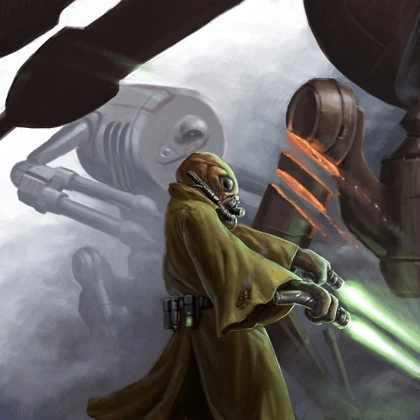 Джедай-ганд сражается с боевыми дроидами LR-57.