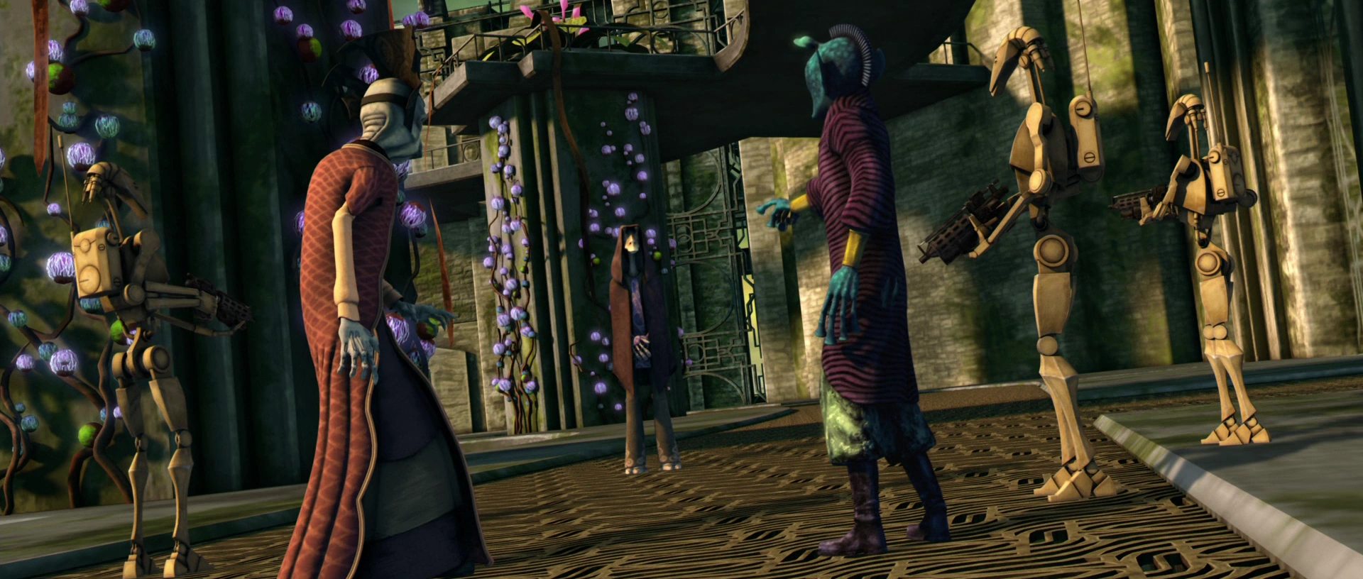 Падме спасает C-3PO, но удивлена тем, что сепаратисты принимают Джа-Джа за джедая. Она говорит Трипио, что надо найти станцию связи, чтобы позвать на помощь армию клонов. Между тем Ганрей прибывает на своём шаттле и говорит Онаконде, что поставки будут осуществляться после казни Падме. Родианец пытается возражать, но Ганрей настаивает, заявив, что Родия сейчас находится под его защитой. Онаконда понимает, что он совершил большую ошибку, примкнув к сепаратистам.