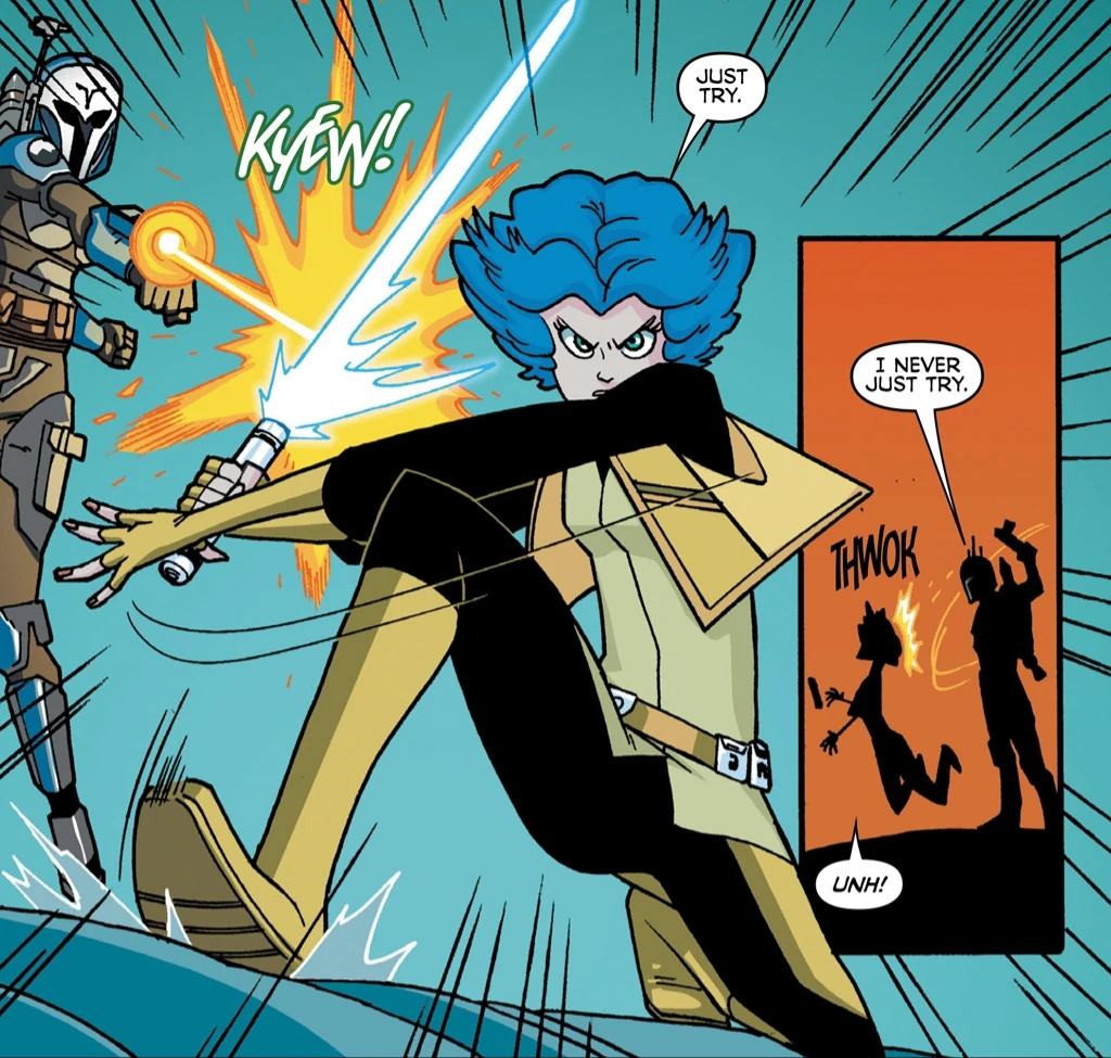 Бо-Катан, справа снизу, возглавляет Ночных сов во время погони за Бонтери и Тано