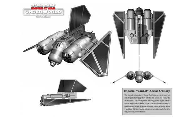 Воздушая артиллерийская установка «Ланцет» была репульсорным средством. Дизайн напоминал шаттл T-4a класса «Лямбда» и бомбардировщик TIE/sa. Посередине размещалась протонно-лучевая пушка, ориентированная вниз для поражения одиночных наземных целей. Для воздушного боя имелись лазерные пушки, которых, впрочем, было недостаточно для эффективной борьбы с вражеской авиацией, потому единицы требовали прикрытия.[2]