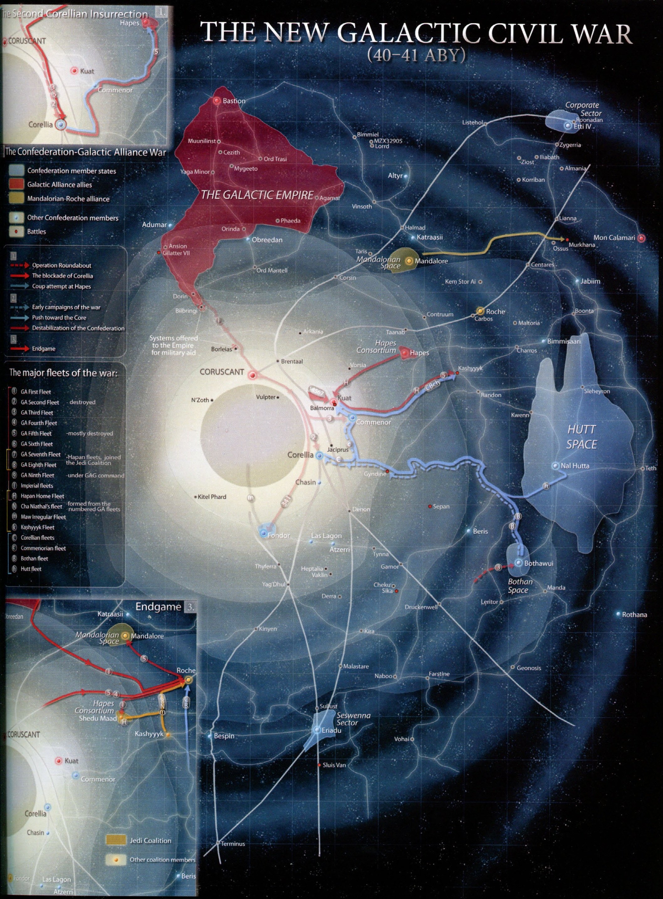 Вторая галактическая гражданская война, первоначально называемая Второе кореллианское восстание, а также известная как Война Конфедерации и Галактического Альянса, Война Кореллии и Галактического Альянса, Новая галактическая гражданская война и Корусантско-кореллианская война продолжалась с 40 ПБЯ до 41 ПБЯ. Изначально это был конфликт между Пятью мирами — которые позднее расширились, чтобы стать межзвёздным союзом, известным как Конфедерация, — и Галактической Федерацией Свободных Альянсов. Конфликт начался, когда Кореллианская система отделилась от Альянса и получила союзников, таких как Ботавуи, Беспин и Фондор, образовав Конфедерацию. Поскольку конфликт быстро обострился, наряду с Альянсом с повстанцами сражался Новый Орден джедаев. Многие из тех, кто когда-то были союзниками во время Первой галактической гражданской и Юужань-вонгской войн, оказались в период конфликта по разные стороны баррикад.