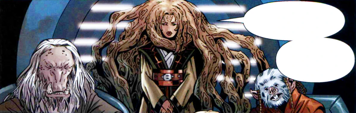 - «Мы упускаем важный момент. Будучи джедаями, мы либо игроки в политике ГА, либо очередной инструмент избранного лидера, вроде флота. Если мы ― последнее, то мы можем иметь собственное мнение, но поступаем так, как велит нам законный лидер. Если нет ― то у нас не больше прав начать вмешиваться в статус-кво, чем у монстра, бредящего анархистской партией».