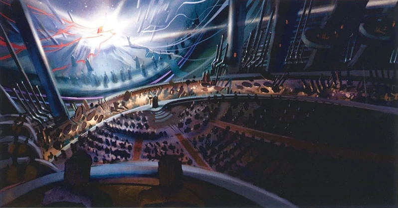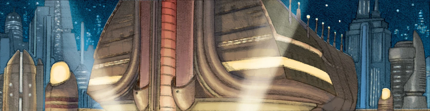 Висевший в воздухе на кронштейне из дорожных полотен и пешеходных пандусов сверкающий шар Галактического оперного театра был возведён как альтернатива Корускантской опере, которой десятилетиями покровительствовали дом Валорум и другие влиятельные династии с планет Центральных Миров[1].