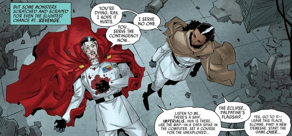 Ракс попенял ей на то, что она начала действовать за его спиной, но предложил дать ему ещё один шанс на совместную работу на благо Империи. Ракс рассказал Рей, что у него есть тайный план нападения на Чандрилу, столицу Республики. Кроме того, он предложил гранд-адмиралу свою поддержку, если та решит занять пост Императора, и заверил её, что он лишь советник, отказавшись, однако, раскрыть свои истинные намерения. Слоун ушла, получив обещание узнать больше о тайном плане Ракса, когда для того должно было прийти время[1].