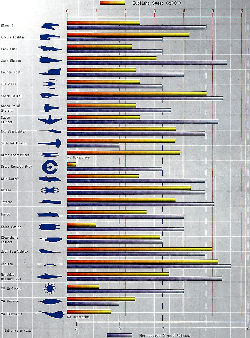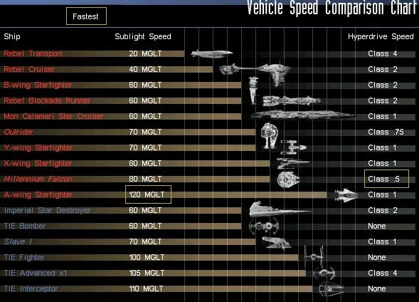 Сверхсветовая скорость гипердвигателя была оценена по убывающей шкале: чем быстрее гипердвигатель, тем ниже рейтинг. Она была основана на асимптотической шкале с 0,0 класса, что является бесконечной скоростью. Эти оценки, как правило, называют «классы», хотя они часто были противоречивы или неточны[16][17][18]. К концу Войн клонов большинство военных кораблей использовали класс 3.0 или 2.0. Во время Галактической гражданской войны военные корабли и истребители, как правило, оснащались гипердрайвами класса 1.0 или 2.0, промышленные и грузовые звездолёты — класса 5.0 и выше. Многие суда оснащались резервным гипердвигателем значительно высшего, то есть медленного класса, чем основной гипердвигатель[14].