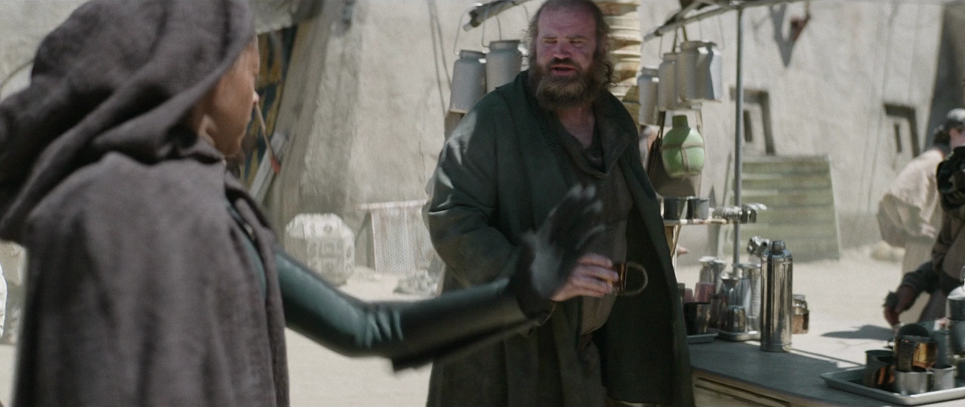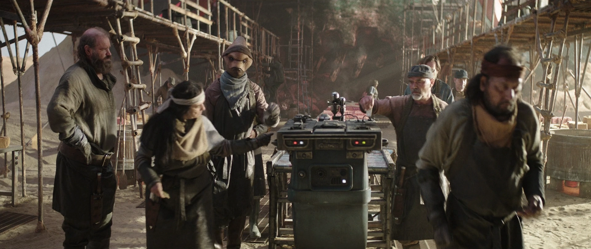 Получив[1] свою[2] зарплату, один из работников по имени Паду Черд возмутился тому, что получил лишь половину от заработанного, и умолял Дичера выплатить денежные средства в полном объёме, однако старшина лишь оттолкнул Черда и предупредил, что он останется совсем без кредитов, если скажет ещё хоть слово. Оби-Ван Кеноби, стоявший последним в очереди за выплатами[1], грозно посмотрел[2] на Дичера, когда тот приблизился, но после вопроса старшины о том, хочет ли Кеноби что-нибудь сказать, тот молча взял свою зарплату и отправился на служебном транспорте обратно в город Анкорхед. Дичер усмехнулся, после чего заговорил с другими рабочими на станции на неизвестном языке[1].