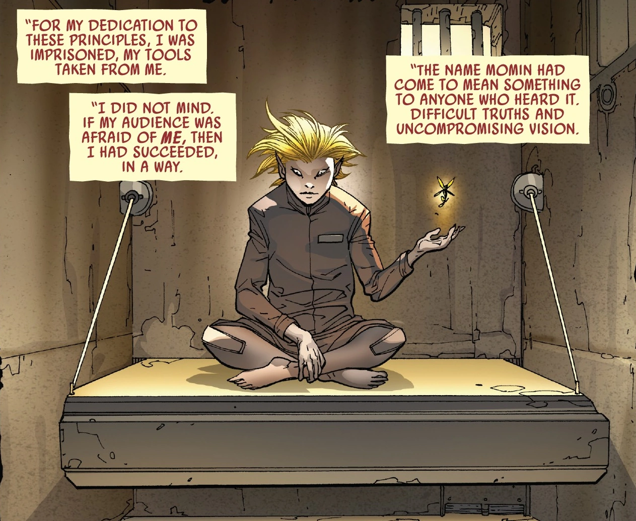 С юных лет Момин пришёл к выводу, что творение существует лишь тогда, когда вызывает чувство ужаса у окружающих, в противном случае оно не существует вовсе. Он не осознавал своих возможностей, пока не стал тренироваться у леди Шаа. После её смерти Момин стал очень независимым и искал знания тёмной стороны для себя. В конечном счёте он понял, что люди не достойны его работ, и лишь Сила могла по-настоящему оценить его. Желая создать что-то достойное Силы, он желал заморозить во времени город невинных в момент, когда их лица будут подвержены ужасу от предстоящей смерти.[1]