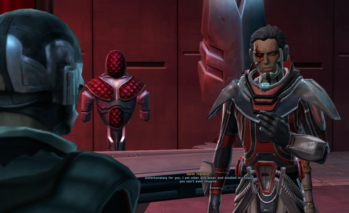 В конце сюжетной линии класса «Ситх-инквизитор» игроку придется сразиться насмерть с Дартом Танатоном. После его гибели игрок получит титул Дарта от Дарта Марра и займет место в Тёмном совете вместо Танатона. При этом, в зависимости от пути по которому следовал игрок на протяжении сюжета, имя персонажа может отличаться. Так имя Дарт Окклус даётся персонажу с «непостижимой репутацией» (или нейтральному персонажу)[74], Дарт Империус — при репутации «верного слуги Империи» (или светлому персонажу)[75], и имя Дарт Нокс — если персонаж имеет репутацию «мастера Тёмной стороны» (тёмному персонажу).