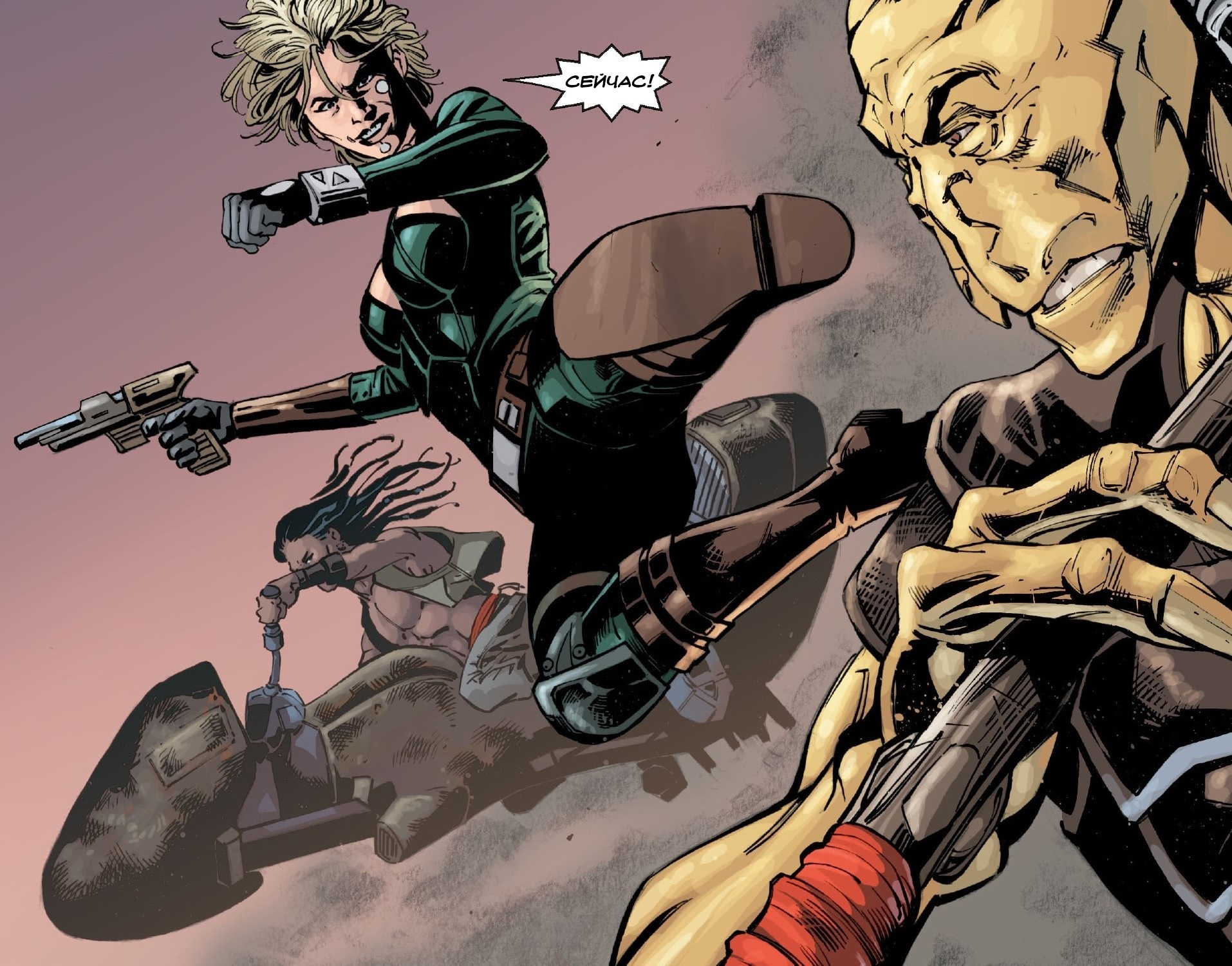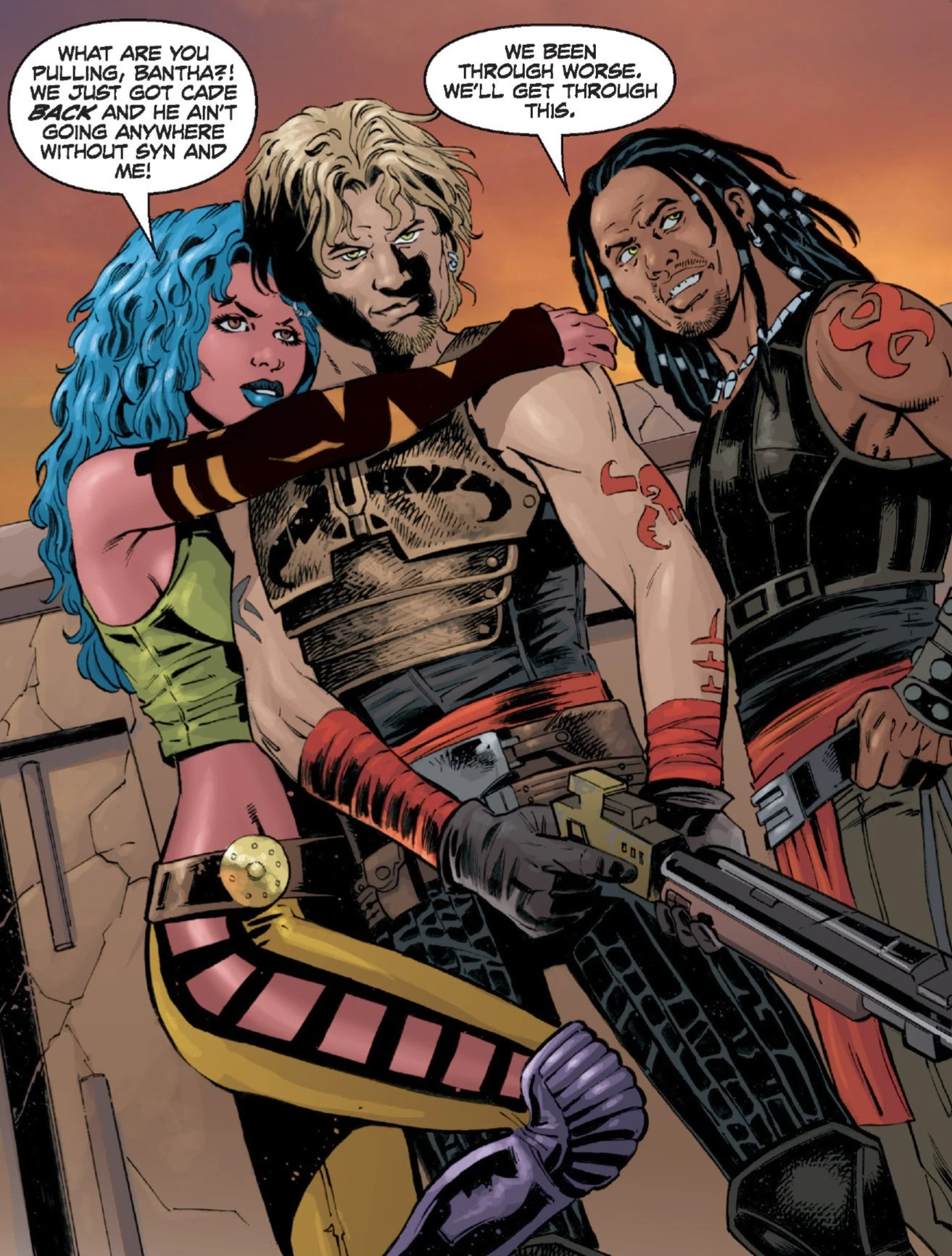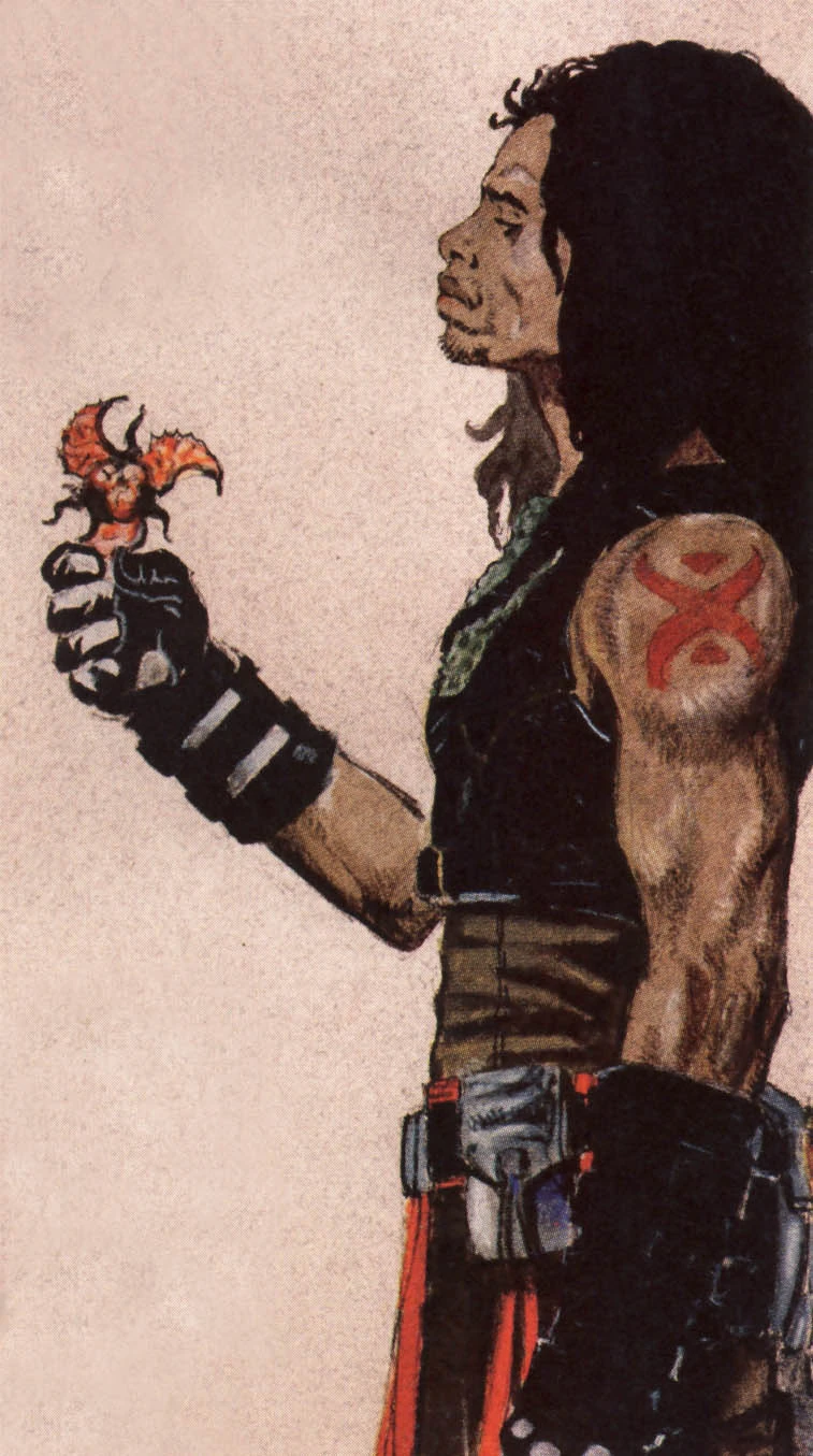- «Я — Кейд, другой парень — Джарая Син, а леди у дверей — Делия Блю. Мы здесь за одним разумным существом. Мы просто заберём его и уйдём. Прочие — оставайтесь на месте, и у вас не будет неприятностей».