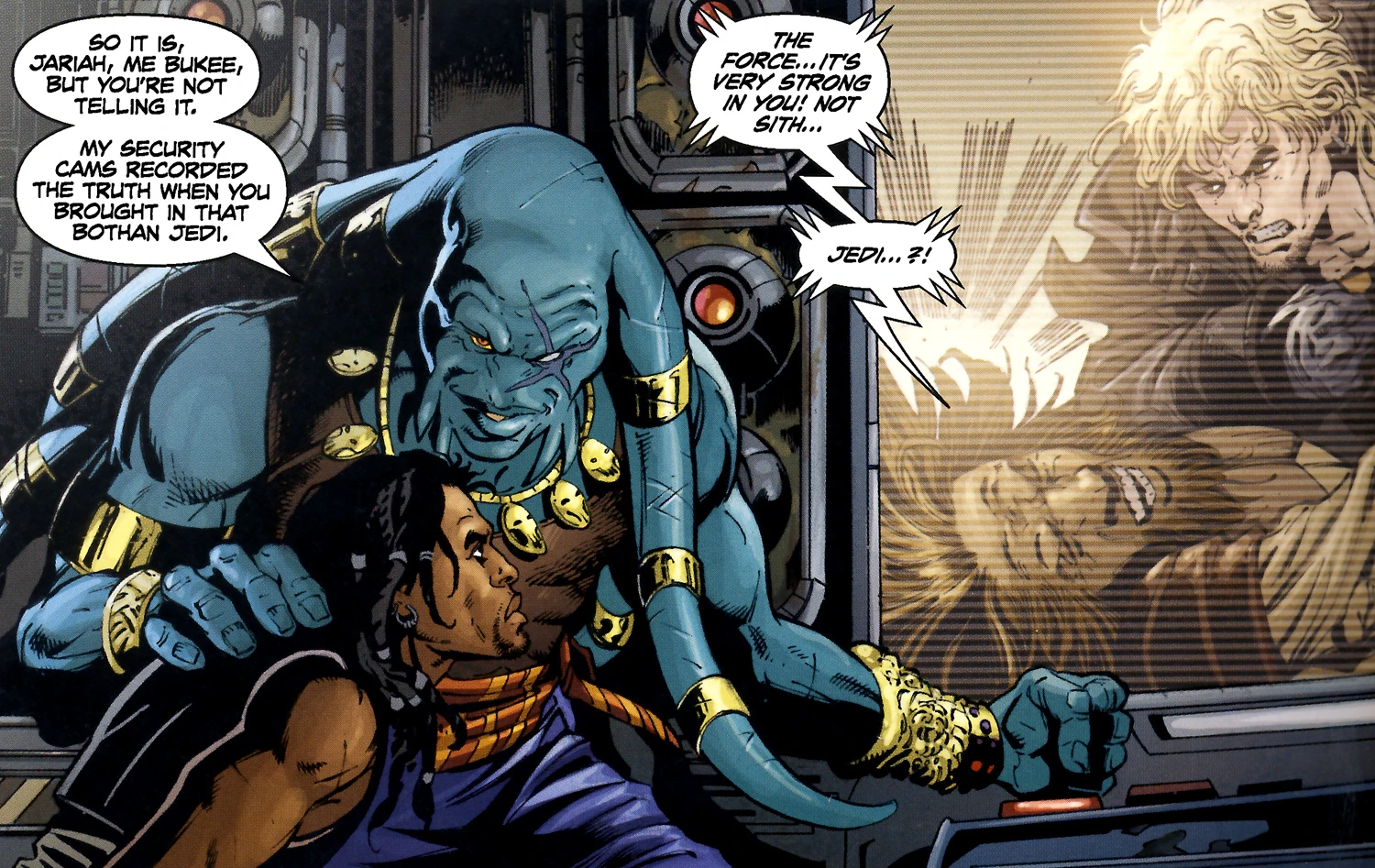 - «Я не люблю джедаев. Не верю им! Они могут взять ваш разум под контроль — заставить вас делать штуки. Может, это ты заставил нас подобрать те бластеры и сражаться с ситхом!»