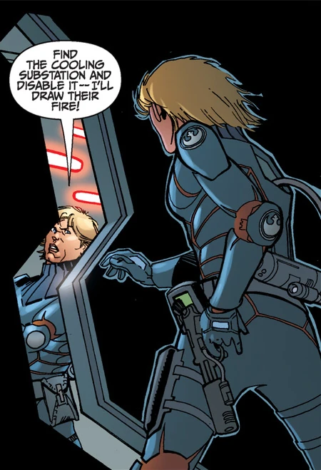 Хотя Шан не была уверена, что сможет выполнить задание в одиночку, она сумела взять себя в руки и вскоре добралась до комнаты контроля систем охлаждения. Обнаружив там одного инженера, она оглушила его и отключила системы пожаротушения. Хотя её часть задания была выполнена, она знала, что, перед тем, как бежать, она должна попытаться спасти своих товарищей. Просматривая главные базы данных станции, она без особого труда выяснила, где держат Люка и Лею, но при этом обнаружила, что Империя в ответ на битву при Явине готовит крупномасштабную атаку[15] на Ансион.[16] Закончив поиск, Шан связалась с Бассо, который сумел выжить, когда в засаду попала и его группа. Хотя Бассо и не мог помочь Шан, он договорился с ней встретиться наверху станции после того, как она освободит остальных. Но, прежде чем Шан смогла это сделать, она столкнулась с начальником службы безопасности станции капитаном Ришиком и сопровождавшим его отрядом штурмовиков.[15]