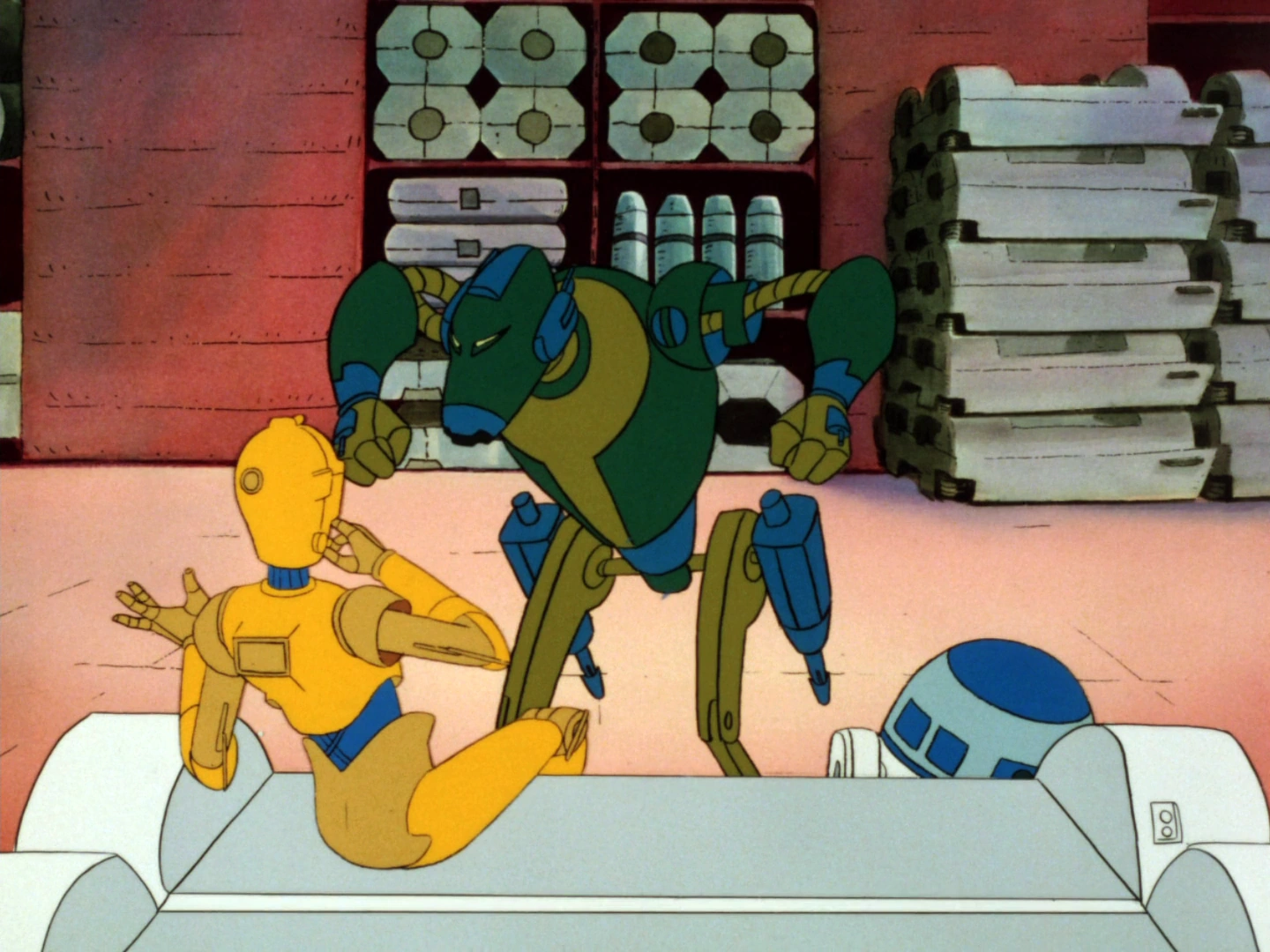 C-3PO и R2-D2 спасло от рассвирепевшего дроида то, что в этот момент корабль попал в метеорный рой, и сорвавшиеся с полок грузовые контейнеры упали на дроидов-наёмников. После этого дроиды-наёмники спешно покинули грузовую зону корабля.