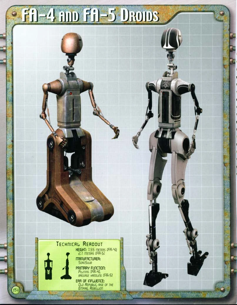 Дроиды серии FA, самыми распространёнными из которых являлись дроид-пилот FA-4 и дроид-лакей FA-5, были разработаны корпорацией «Соро-Сууб», которая имела исключительное право на производство дроидов этой серии. В последние десятилетия существования Галактической Республики эти модели дроидов были обычным зрелищем в космопортах планет Центральных Миров, где FA-4 доставляли пассажиров из космопортов в гостиницы, а FA-5 помогали им управляться с багажом. Дроиды различных компаний-перевозчиков, работавшие в одном космопорту, обычно отличались окраской корпусов[2]. Также этих дроидов можно было увидеть в других оживлённых местах, например, около Здания Администрации Республики на Корусанте[3].