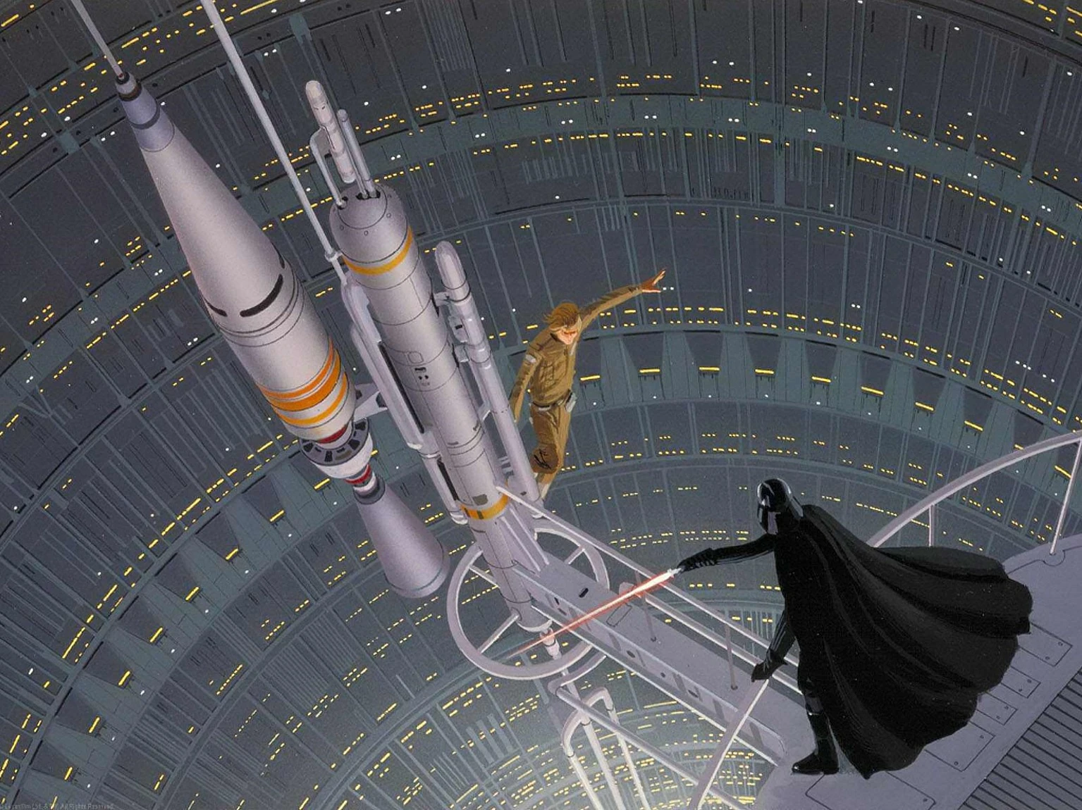 На обслуживающей платформе Облачного города Вейдер и Скайуокер-младший продолжали дуэль. Вейдер повалил Люка и предложил ему сдаться, чтобы он не дал убить себя, как Оби-Вана, но Люк отказался сдаваться и продолжил сражаться.