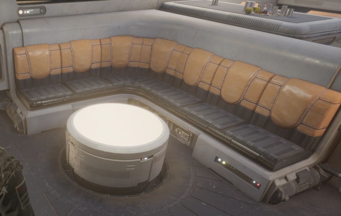 У «Богомола» имелось три отдельные наружные секции — носовая, вращающийся сегмент и кормовая. Внутри же находилось пять зон — кабина, комната с голографическим столом, камбуз — или общая зона, — главный коридор и машинное отделение. Фонарь кабины транспортного средства за счёт огромных иллюминаторов в полу ориентировался преимущественно на сектор нижнего обзора, что вместе с приподнятыми креслами создавало неплохой панорамный вид для пилотов. Кабина включала в себя два места для пилотов и ещё одно, сбоку, предназначалось для связиста. В следующем отсеке находился голографический стол, позволявший изучать карту Галактики и отдельных планет, с сидениями полукругом. За ним были оборудованы два посадочных телескопических трапа для того, чтобы пассажиры имели возможность спуститься по обе стороны корабля в зависимости от его ориентации при посадке. Далее можно было попасть в общую зону, перед лестницей в которую, рядом с несколькими террариумами, находилась гостиная зона со столом и контейнером для хранения продуктов. За дверью в задней части начинался главный коридор с тремя отдельными дверями, ведущими в другие помещения корабля, и этот коридор завершался в машинном отделении: два уровня, соединенных лестницей. На верхнем этаже находилось спальное место, которое впоследствии занял Кэл Кестис, перила, диагностические приборы и верстак. Гипердвигатель был виден за рабочим столом, а само помещение располагалось внутри вращающейся секции корабля. При спуске вниз по лестнице, можно было попасть в более тёмный коридор с двумя спасательными капсулами на противоположных концах.[3]