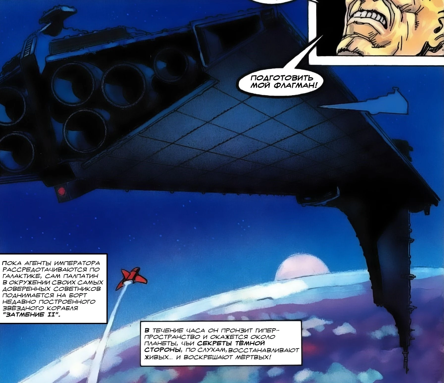 - «Справочник по «Тёмной Империи» заявляет, что «Затмение» было 17,5 км в длину, что противоречит описанию из самого комикса «Тёмная империя», где говорится, что звездолёт «достигает десяти миль от конца до начала», или 16 км. Возможно, эти данные предназначены показать различия между первым и вторым «Затмениями». Если имелись в виду морские мили, заявленная длина «Затмения» будет больше названной величины, то есть 18,52 км.