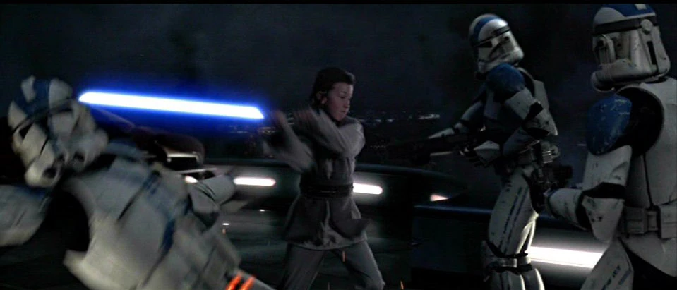Прокладывая себе дорогу к посадочной площадке, Джукасса одновременно отражал выстрелы клонов.[2]
