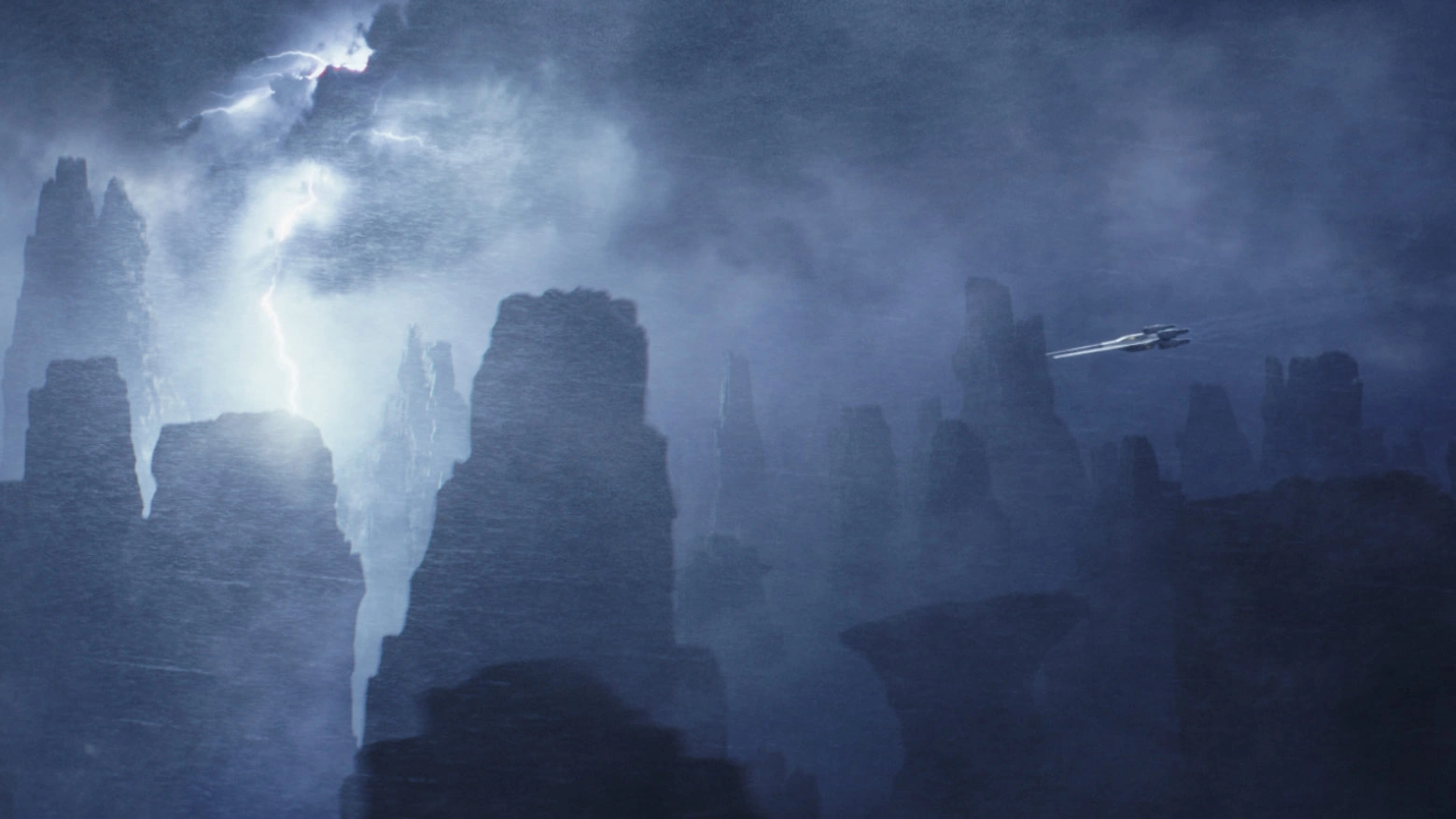 Звёздные истребители T-65B «X-wing» пролетают сквозь каньоны Иду.