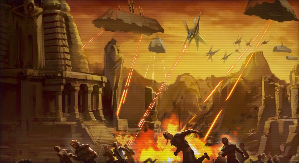 - «Руины, что ты видишь вокруг себя — разграбленные могилы древних повелителей ситхов. Каждая гробница, содержа великие тайны и мощные реликвии Силы, однажды соприкасалась с историей и наследием Старой Империи ситхов».