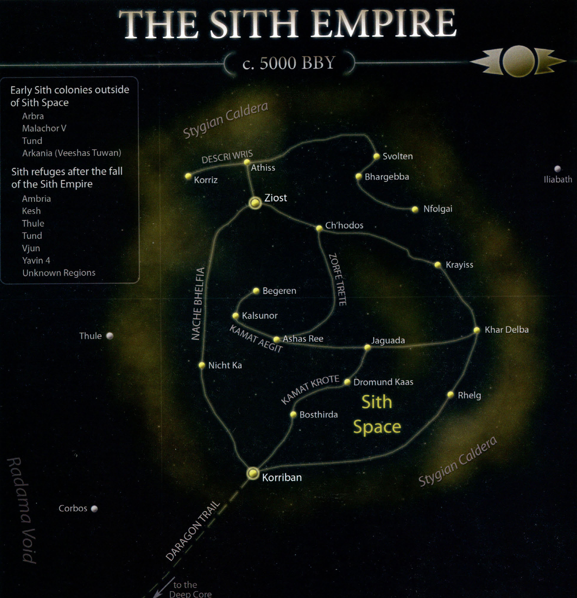 - «Империя ситхов завершила период столетий своего взросления. Оставаясь не обнаруженными Республикой, ситхи захватили все звёздные системы вокруг Коррибана. Теперь же они искали новых возможностей для расширения».