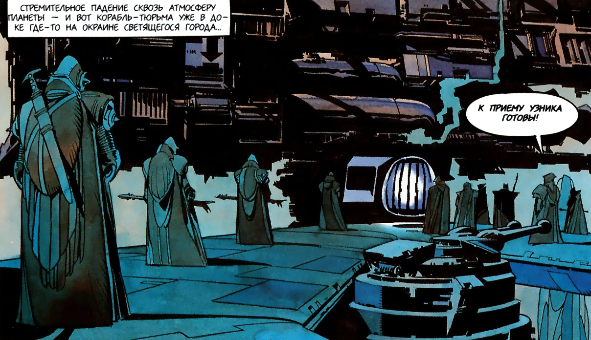 Тюремщики экипировались двумя типами брони. Тип с низким уровнем защиты включал в себя нагрудник, наплечники и бронированный шлем, дыхательные маски, оружие для борьбы с беспорядками и адгезивные гранаты. Броня высшей защиты напоминала броню штурмовика, которая, в числе прочего, имела внутришлемный комлинк, десятиметровый аудио-визуальный датчик движения, динамик и автономный источник воздуха.